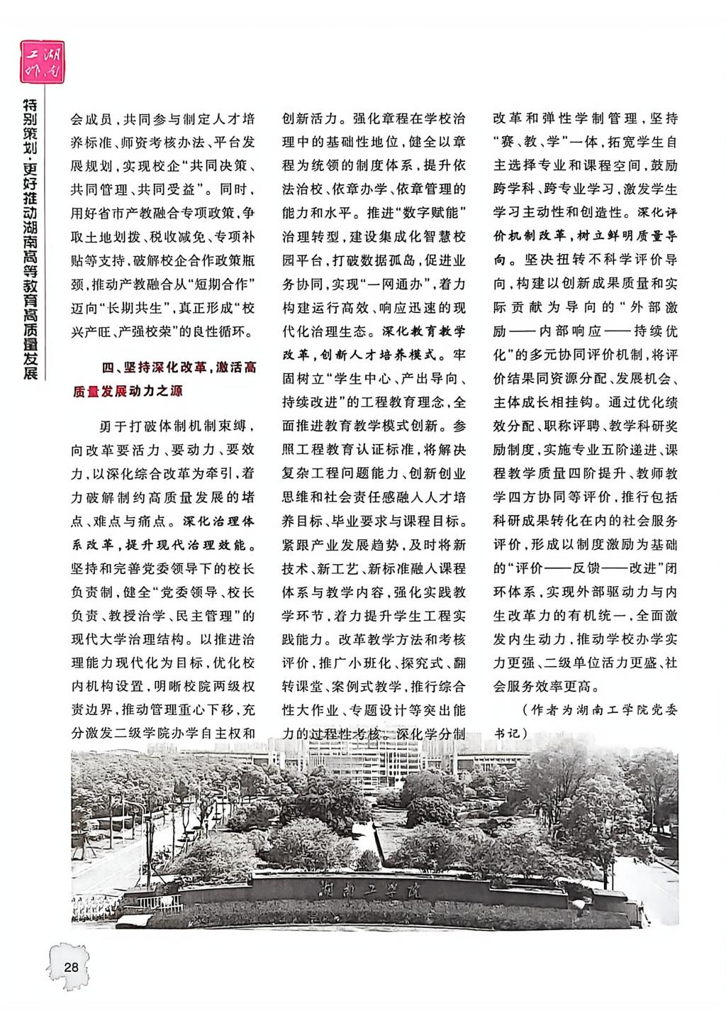 编者按:近日,省委《湖南工作》2025年第10期刊发我校党委书记曹执令教授署名文章《以“四个坚持”推动地方应用型工科院校高质量发展》。文章从“坚持培根铸魂,把稳高质量发展方向之舵;坚持强师赋能,夯实高质量发展人才之基;坚持产教融合,打造高质量发展能力之翼;坚持深化改革,激活高质量发展动力之源”四个方面,向全省推介金冠网址线路检测中心在开拓地方应用型工科院校高质量发展新境界的典型做法与工作经验。